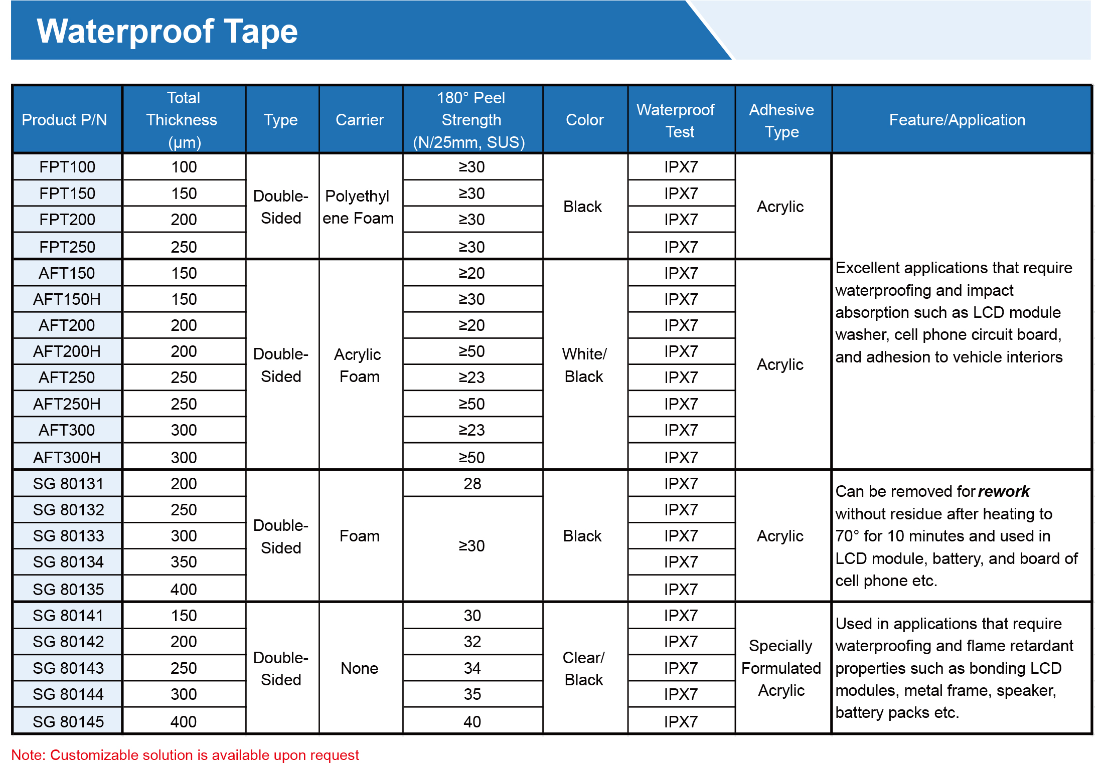 提供各種膠帶,由PET、無紡布、泡沫、涂有丙烯酸、硅樹脂、橡膠、熱熔、熱轉化粘合劑的PI基材制成。可提供各種寬度、長度和釋放襯墊,以滿足特定需求,專為工業(yè)、商業(yè)和家庭應用的特殊環(huán)境而設計。